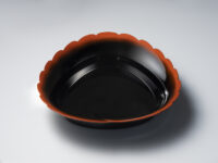 Incense container in the shape of lotus petal, floral scroll design in openwork and inlay, dyed from sappanwood on persimmon wood