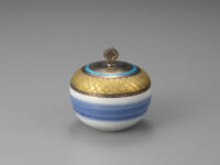 Covered container decorated with lines and an enameled circle