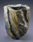 岡部は、陶磁器の産地として知られる愛知県瀬戸に、陶芸家・加藤唐九郎の長男として生まれ、子供のころから陶磁器に親しみました。1940年に21歳で入営し、復員後、本格的に作陶活動を再開すると、織部・志野・黄瀬戸・灰釉・鉄釉などの地元の伝統技法をもとに作域を広げていきます。なかでも器体の全面に縄文を施した織部や志野の作品は極めて独自性が強く、高い評価を得ました。その後、意欲的な作陶姿勢は青瓷の研究へと向けられ、厳しく凛とした器形に、しっとりとした艶のある不透明な釉調の〈粉青瓷〉、透明感ある釉調と青緑の釉色が美しい〈翠青瓷〉、そして、誰もが為し得なかった黄褐色の〈窯変米色青瓷〉など、世に「嶺男青瓷」と呼ばれる独特の釉調や釉色の青瓷釉をまとう作品を生み出したのです。