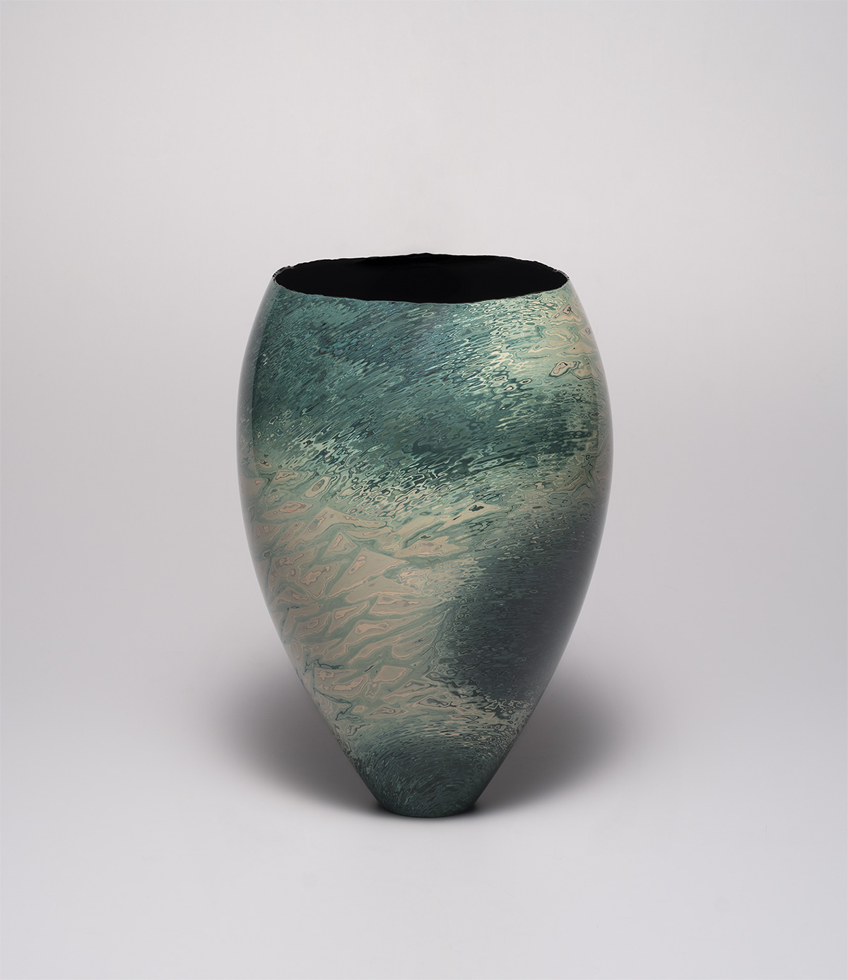 中田の作品は、彼女の記憶に強く残っている景色のイメージを蒟醤技法にて抽象的に描き出すのが特徴です。本作も、金沢の自宅から見た空に浮かぶ雲と香川県漆芸研究所時代に見た瀬戸内海の凪いだ海のイメージを重ねて制作をしたと述べています。再び作品に目を向けてみると丹念に磨き上げられた曲面は見る角度によっても印象を変え、作品に一つとして同じ景色はなく、まるで雲や海の常に変化し移り行く様子を体現しているようです。そして波打つ口縁部は、その流動的な動きがさらに続く予感さえも与えます。しかしながら、漆黒に塗られた内部は動きが止まり、まるで吸い込まれるよう。