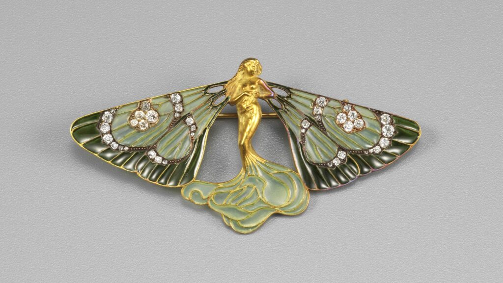 展覧会は「第1章 ガレとドーム兄弟 情景を描く」、「第2章 ラリック ジュエリーからガラスへ」、「第3章 時代とともに ラリックとアール・デコ」という全3章から成る。まず第1章で、草花や自然の情景をモチーフとした、ガレやドームのアール・ヌーヴォー様式のガラス器をたっぷりと見た後に、第2章の会場となる2階の展示室へと移動して、いよいよラリック作品と対面する演出である。そこにはジュエリーとガラス作品がほとんど区別されることなく展示されていた。そのため、どちらも草花や昆虫、人体の有機的な曲線が造形の基となっていることが実感され、さらにまた、ガレやドームとの違いにも自ずと意識が向いた。すなわち、第1章で見たガレらが、時にグロテスクなほど自然の形を生々しく写したり、自然景をそのまま表すのに対して、ラリックがイメージをより抽象化していることに気づくのである。例えば《ブローチ 翼のある風の精》[図1]では、人から蝶へと変容するような姿の妖精が流れるような曲線で表され、単に自然の外形を写すのではなく、昆虫が変態するエネルギーを造形しているように思えた。