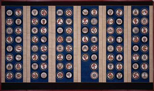 麻地藍丸紋いろは尽くし六曲屏風