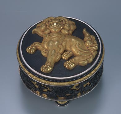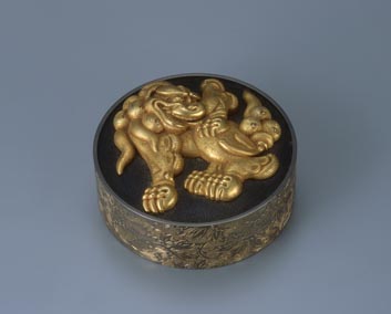 獅子牡丹彫金円形小筥