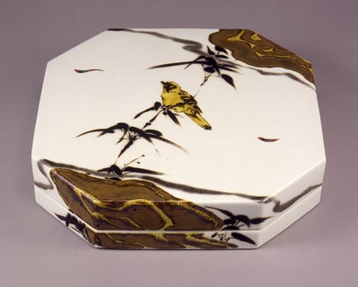雪白釉釉描加彩竹雀図四角隅切筥