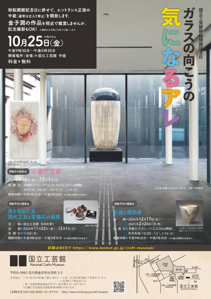 エントランス正面の中庭(通常は立入禁止)を開放します。金子潤の作品を間近で鑑賞しませんか。記念撮影もOK! 日時:2024年10月25日(金)9:30~17:30場所:国立工芸館中庭 ※雨天中止※撮影はお客様ご自身でお願いします 金子潤《無題 13-09-04》2013年 写真:太田拓実