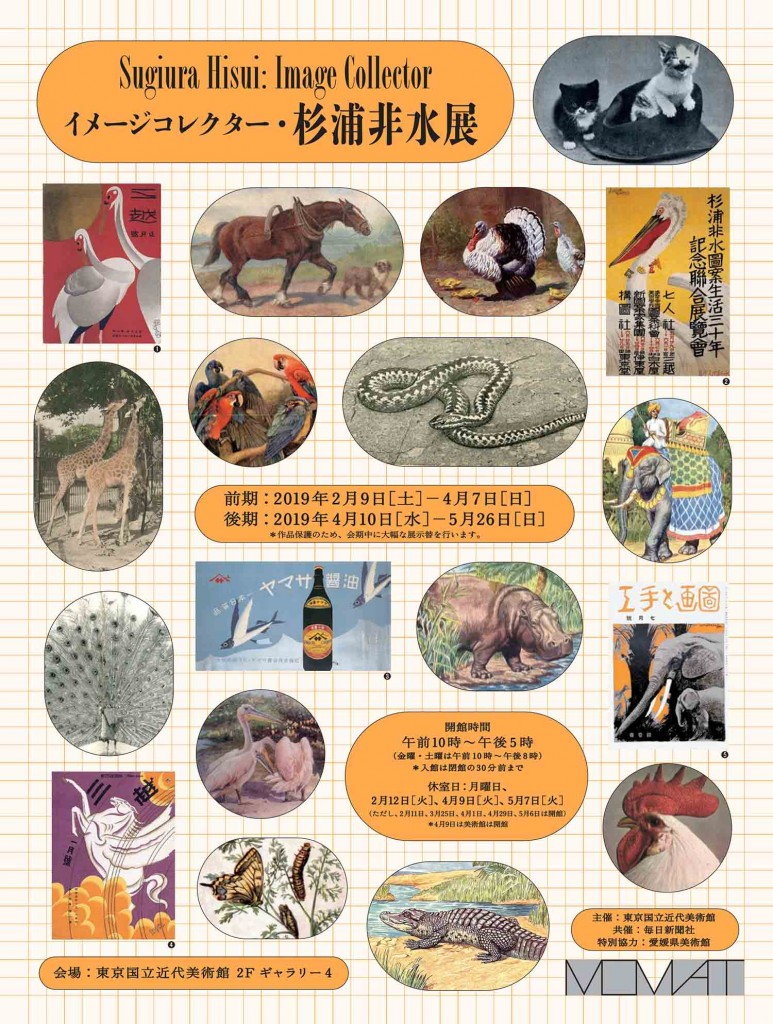 展覧会について 日本のグラフィックデザインの創成期に、重要な役割を果たした図案家の杉浦非水。当館ではご遺族から一括寄贈された非水のポスター、絵はがき、原画など700点以上を収蔵しています。本展では三越のためのポスターや、数多く手がけた表紙デザインの仕事、原画やスケッチなど、19年ぶりに当館の非水コレクションを一堂に展示します。 さらに今回は、非水が手元に残した海外の雑誌やスクラップブック、16mmフィルムなど、貴重な旧蔵資料も初公開します。図案の創作にいたるまでの「イメージの収集家」としての側面に焦点をあて、杉浦非水の活動を改めて紹介します。 杉浦非水《銀座三越 四月十日開店》 1930年 東京国立近代美術館蔵 杉浦非水が集めた雑誌の切り抜きや絵はがき 年代不詳東京国立近代美術館蔵 杉浦非水によるスクラップブック 年代不詳東京国立近代美術館蔵 杉浦非水略歴 イベント ギャラリートーク 「杉浦非水の目と思考―旧蔵資料から見る」 2月22日[金] 長井健氏(愛媛県美術館 学芸グループ担当係長・専門学芸員) 「杉浦非水と戦前日本の小型映画」 4月19日[金] 冨田美香氏(国立映画アーカイブ 主任研究員) 「イメージコレクターの眼」 5月25日[土] 中尾優衣(当館主任研究員・本展企画者) ※ 各日とも18時から2階ギャラリー4にて、申込不要・参加無料(要観覧券) カタログ 開催概要 東京国立近代美術館 2階 ギャラリー4 前期:2019年2月9日(土)-4月7日(日)後期:2019年4月10日(水)-5月26日(日)*作品保護のため、会期中に展示替えを行ないます。 10:00 - 17:00(金曜・土曜は20:00まで)※入館時間は閉館30分前まで 月曜日(2月11日、3月25日、4月1日、4月29日、5月6日は開館)、2月12日[火]、4月9日[火](※本展のみ)、5月7日[火] 一般500円(400円) 大学生250円(200円) ( )内は20名以上の団体料金。いずれも消費税込。 高校生以下および18歳未満、65歳以上、キャンパスメンバーズ、「MOMATパスポート」をお持ちの方、友の会・賛助会会員、MOMAT支援サークルパートナー企業(同伴者1名迄。シルバー会員は本人のみ)、障害者手帳をお持ちの方とその付添者(1名)は無料。 それぞれ入館の際、学生証、運転免許証等の年齢の分かるもの、会員証、障害者手帳等をご提示ください。 一般 300円 大学生 150円 本展の観覧料で、入館当日に限り、所蔵作品展「MOMATコレクション」(4-2F)もご観覧いただけます。 2月24日(日)、3月3日(日)、4月7日(日)、5月1日(水・祝)、5月5日(日)、5月18日(土)(国際博物館の日)※ 2月24日(日)は天皇陛下御在位30年を記念して入館無料です。※5月1日(水・祝)は皇太子殿下が御即位されることを祝して入館無料です。 東京国立近代美術館 毎日新聞社 愛媛県美術館