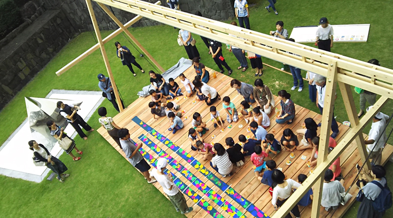 展覧会の出品建築家dot architects(家成俊勝+赤代武志)とデザイナー吉行良平氏のコラボレーションで、前庭に「夏の小屋」をつくるワークショップを開催!