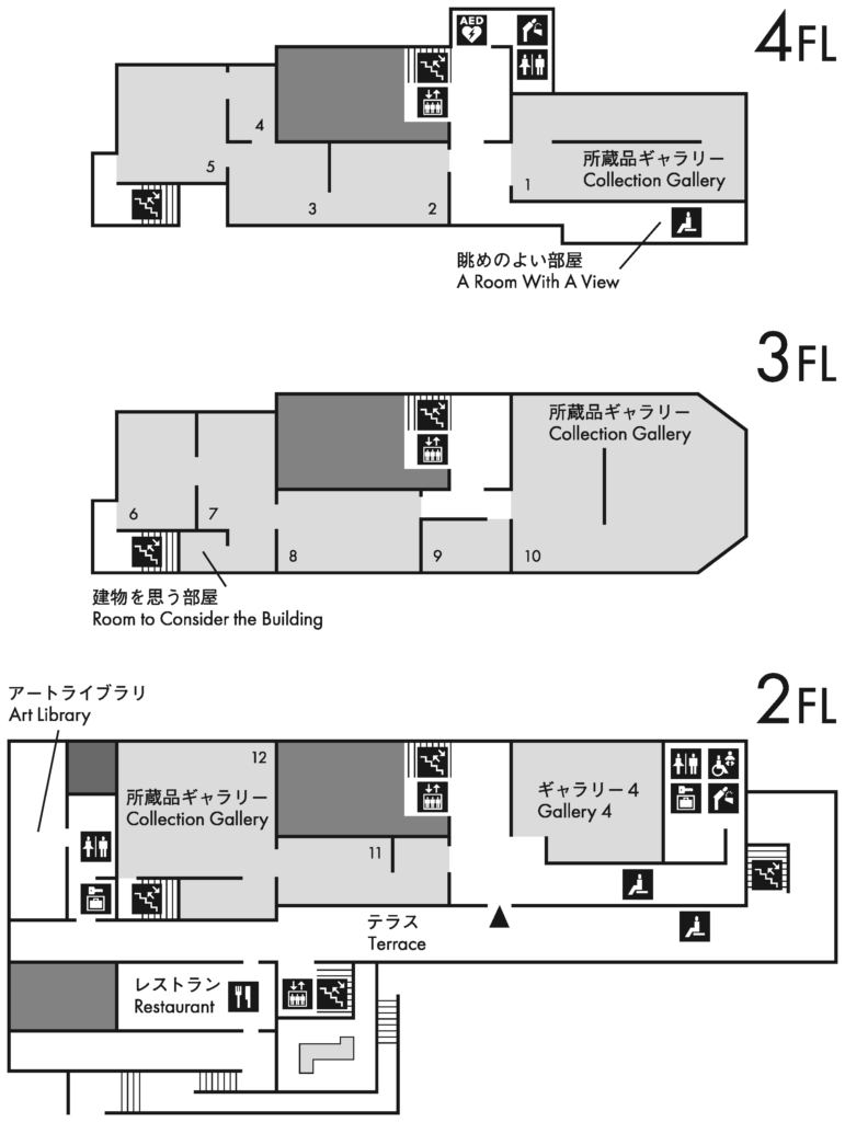 MOMAT 컬렉션은 3층에 전시되어 있으며, 12개(때로는 13개)의 방과 2개의 휴식 공간으로 구성되어 있습니다. 2층 테라스 근처와 미술관 앞에도 조각 작품이 전시되어 있습니다. 창문 너머 황궁 일대를 내려다볼 수 있는 “전망실”은 4층에 있으며 휴식할 수 있는 의자도 마련되어 있습니다. 이 외에도 미술관 곳곳에는 의자가 배치되어 있습니다. MOMAT 컬렉션 입구는 4층에 있으며 3층과 2층으로 연결되어 있습니다.