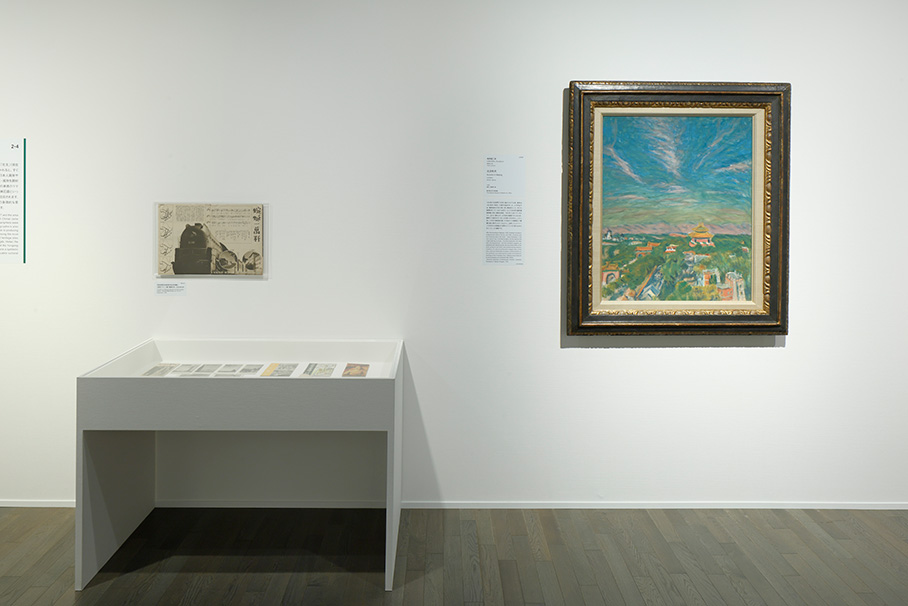 そして、満洲観光史を研究する筆者が深く惹きつけられたのは、第2章「アジアへの/からのまなざし」であった。戦前のアジアは、日本人にとって植民地であり、戦場であり、同時に観光地でもあった。その多層的な現実は、展示空間の配置にも表れている。戦場を描いた戦争画のすぐ隣に、同地域の風景画や南満洲鉄道株式会社(満鉄)のガイドブック、満洲観光聯盟の絵はがきが並ぶことで、戦争と観光が交錯し、互いに響き合う二重のリズムを生み出す。観光の軽やかな旋律の背後に、戦争という重い和音がひそむことに気づかされ、観る者はその複雑で微妙なハーモニーに引き込まれるのである。