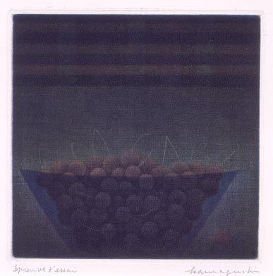 日本で初めての国際版画展、第1回東京国際版画ビエンナーレ展で、浜口は国立近代美術館賞(国内大賞)を受賞しました。本作はその時の出品作のひとつ。暗い背景からモチーフだけが浮かび上がる浜口の作品では、モチーフどうし、あるいはモチーフと周囲の空間との緊張関係が、静けさや詩情を引き立てます。そこには、西洋の静物画とは異なる、日本の伝統的な「間」にも通じる「日本人的な感覚」が働いていると評価され、受賞にいたったといいます。