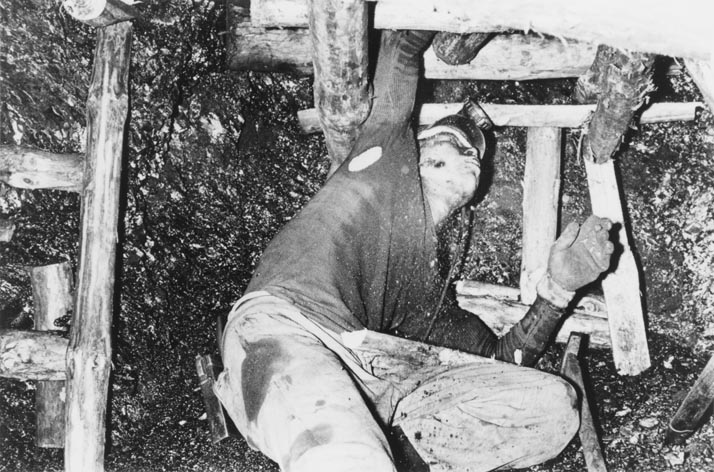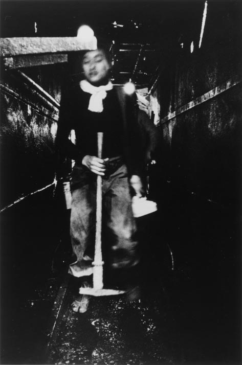 「人間の土地」より 緑なき島−軍艦島: 立坑のリフトに乗る坑夫達