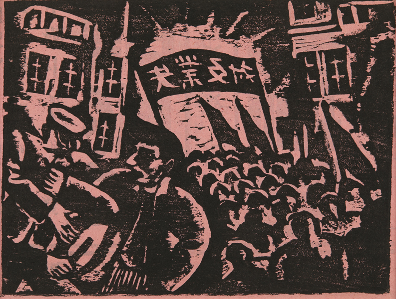 工場に進む赤旗