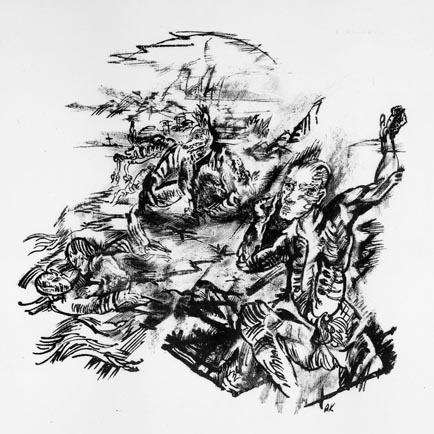 版画集『つながれたコロンブス』より 8. 両腕を上げた男と死の姿