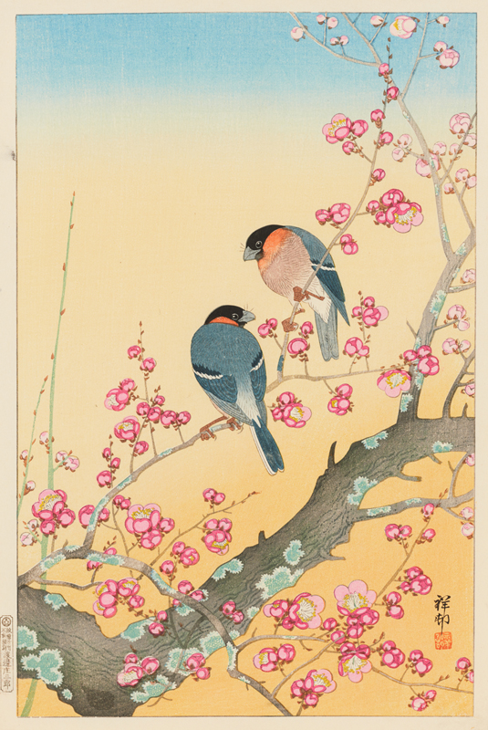 [鷽二羽と紅梅]