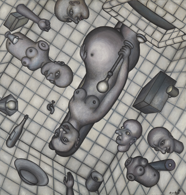 お皿、瓶、腕や首が浴室の中を漂っています。上下左右もはっきりしない狭苦しい空間を見ていると、落ち着かない気分になります。その原因は、タイルの目にあります。人は、体のバランスを保つ平衡感覚に基づいて、垂直、水平な線に安定した心地よさを感じます。しかしここではタイルの升目が作る縦、横の線が、絵のフレームの垂直、水平線から斜めにズレています。中央の妊婦が手にする器具の先端が特に明るく描かれています。この球を軸に絵の中の空間は回転し始め、人も物もばらばらにしてしまうかのよう。当時の社会が抱えていた精神状態を表現したとも言われる、この絵が呼び起こす不安さの裏には、こんな造形的工夫も隠されています。