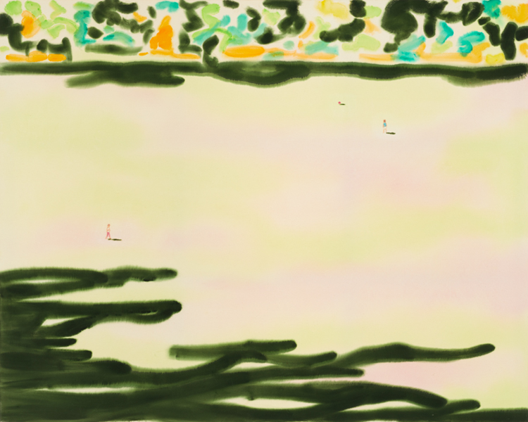 点在する人物に気づかなければ、抽象的な絵のようです。特定の図を認識しにくいからというより、いかにも自由に広がる絵の具のふるまいが、そう思わせるのでしょう。地塗りを施していないキャンバスに薄く溶いた絵の具をにじませる、ステイニング(染み込み)技法の効果です。コントロールしきれない絵の具の動きは水面を思わせます。作者によればこの風景は、かつて過ごしたベルリンの広い公園に子供を連れて行った記憶に基づいているそうです。