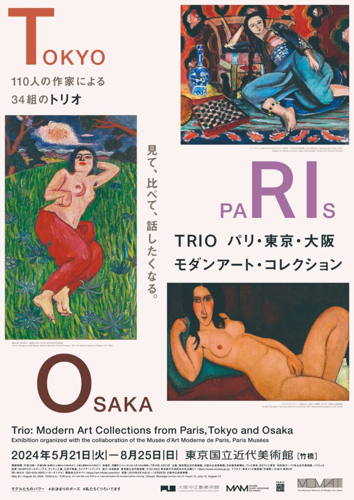 見て、比べて、話したくなる。 パリ、東京、大阪-それぞれ独自の文化を育んできた3都市の美術館のコレクションが集結。セーヌ川のほとりに建つパリ市立近代美術館、皇居にほど近い東京国立近代美術館、大阪市中心部に位置する大阪中之島美術館はいずれも、大都市の美術館として、豊かなモダンアートのコレクションを築いてきました。本展覧会は、そんな3館のコレクションから共通点のある作品でトリオを組み、構成するという、これまでにないユニークな展示を試みます。時代や流派、洋の東西を越えて、主題やモチーフ、色や形、素材、作品が生まれた背景など、自由な発想で組まれたトリオの共通点はさまざま。総勢110名の作家による、絵画、彫刻、版画、素描、写真、デザイン、映像など150点あまりの作品で34のトリオを組み、それをテーマやコンセプトに応じて7つの章に分けて紹介することで、20世紀初頭から現代までのモダンアートの新たな見方を提案し、その魅力を浮かびあがらせます。 萬鉄五郎《裸体美人》は7月23日(火)~8月8日(木)の期間、作品保護のため展示を一時休止し、8月9日(金)より展示を再開いたします。なお、休止期間中は萬鉄五郎《裸婦(ほお杖の人)》を展示いたします。 出品作家 カレル・アペル天野龍一有元利夫ジャン・アルプ(ハンス・アルプ)アルマン(アルマン・フェルナンデス)池田遙邨イケムラレイコ石内都出光真子サビーヌ・ヴァイスシュザンヌ・ヴァラドングザヴィエ・ヴェイヤン岡本更園岡本太郎小倉遊亀恩地孝四郎パブロ・ガルガーリョアレクサンダー・カルダーアンリ・カルティエ=ブレッソン河合新蔵川上涼花川崎亀太郎菅野聖子菊畑茂久馬岸田劉生北代省三北野恒富北脇昇草間彌生イヴ・クライン倉俣史朗パウル・クレー小泉癸巳男小出楢重古賀春江佐伯祐三佐藤雅晴 佐保山堯海汐見美枝子マルク・シャガールシャイム・スーティン菅井汲杉浦非水ヘンリー・ダーガー高梨豊辰野登恵子田中敦子サルバドール・ダリ辻永津田洋甫ジュリアン・ディスクリジョルジョ・デ・キリコレイモン・デュシャン=ヴィヨンラウル・デュフィフランソワ・デュフレーヌフェリックス・デル・マルル東郷青児東松照明百々俊二冨井大裕富山治夫ソニア・ドローネーロベール・ドローネーロベール・ドワノー中西夏之奈良美智奈良原一高ジャン=ミシェル・バスキア長谷川利行畠山直哉早川良雄原勝四郎パブロ・ピカソジャン・フォートリエ 藤島武二藤田嗣治ブラッサイコンスタンティン・ブランクーシマリア・ブランシャールヴィクトル・ブローネルアンドレ・ボーシャンウンベルト・ボッチョーニピエール・ボナールセルジュ・ポリアコフ前田藤四郎ルネ・マグリット松本竣介アンリ・マティス丸木俊(赤松俊子)アルベール・マルケ三岸好太郎アンリ・ミショー村山知義ジャン=リュック・ムレーヌジャン・メッツァンジェファウスト・メロッティアメデオ・モディリアーニ百瀬文森村泰昌安井曽太郎柳原義達モーリス・ユトリロ吉原治良萬鉄五郎ジェルメーヌ・リシエエル・リシツキーマルク・リブーフェルナン・レジェマリー・ローランサンマーク・ロスコ 美術館について パリ市立近代美術館 シャンゼリゼ通りとエッフェル塔の間に位置するパリ市立近代美術館の宮殿は、1930年代の壮麗な建築の一例。15,000点以上の作品を所蔵するパリの重要な文化施設であり、フランス最大級の近現代美術館のひとつ。 photo: Fabrice Gaboriau 東京国立近代美術館 東京の中心・皇居のお濠を前に建つ日本で最初の国立美術館。最大の特徴は、横山大観、上村松園、岸田劉生らの重要文化財を含む13,000点を超える国内最大級のコレクション。19世紀末から現代までの幅広いジャンルにわたる日本美術の名作を、海外の作品もまじえて多数所蔵。 大阪中之島美術館 2022年、大阪市中心部に開館。19世紀後半から今日に至る日本と海外の代表的な美術とデザイン作品を核としながら、地元大阪で繰り広げられた豊かな芸術活動にも目を向け、絵画、版画、写真、彫刻、立体、映像など多岐の領域にわたる6,000点超を所蔵。 カタログ 「TRIO パリ・東京・大阪 モダンアート・コレクション」展覧会図録 刊行日:2024年5月21日価格:3,000円(税込)仕様:B5変形、ソフトカバー頁数:216ページ発行:日本経済新聞社 目次 TRIO展について 「思いがけない対話」シャルロット・バラ=マビーユ(パリ市立近代美術館学芸員) 「アカデミスムと「伝統的な日本」との狭間で20世紀前半にパリに渡った日本人芸術家たちの葛藤と挑戦」横山由季子(東京国立近代美術館研究員) 「パリ、東京、大阪、それぞれの都市風景」高柳有紀子(大阪中之島美術館主任学芸員) カタログ Ⅰ 3つの都市:パリ、東京、大阪Ⅱ 近代化する都市Ⅲ 夢と無意識Ⅳ 生まれ変わる人物表現Ⅴ 人間の新しい形Ⅵ 響きあう色とフォルムⅦ 越境するアート 資料編 「パリ・東京・大阪 3館の紹介」にしうら染 年表出品作品リスト 展示風景 展示風景 撮影:木奥惠三 開催概要 東京国立近代