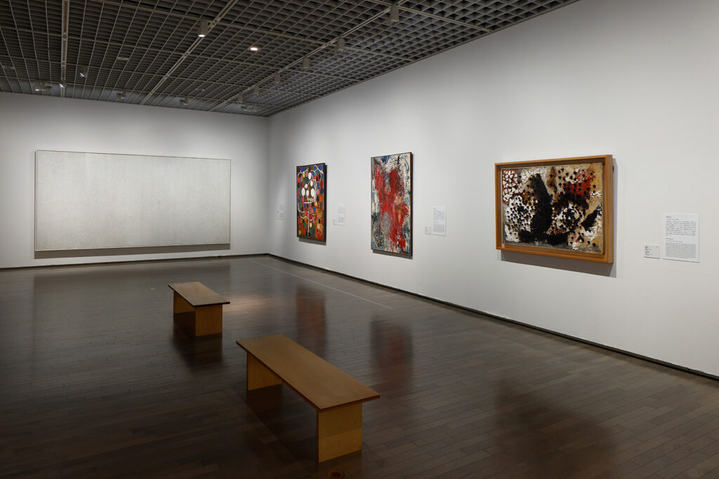 本展のタイトルに改めて目を向けてみたい。中嶋泉の唱える「アンチ・アクション」とは、戦後日本で男性性と結びつくかたちで受容された「アクション(・ペインティング)」を批判する概念である1。しかし、それはジェンダーコード化されるような表現行為への批判であるため、女性性をもとにグルーピングされるといった枠組みを示すものでもない。そうではなく、字義通り「彼女たち、それぞれの応答と挑戦」とあるように、あくまで個別の美術家として「それぞれの」表現を包摂するものとして提示されている。 英語タイトルには「women artists」ではなく、『視線と差異—フェミニズムで読む美術史』等で知られる美術史家・文化研究者グリゼルダ・ポロックの言うところの「artist-women」という語が示されている。本展カタログの目次には、「artist-women はまず彼女たちを「美術家」として位置づけ、その主体が女性であることを示す語であり、ジェンダーや性的アイデンティティを理由に周縁化されてきた多様な美術家を美術史の中心に据える本展の立場を明示する」と注釈されている2。 図1 会場風景|右は田部光子《繁殖する(1)》1958–88年、福岡市美術館蔵|撮影:木奥惠三 こうした点を踏まえポロックに倣えば、本展がなしていることは、従来の美術史に対して女性美術家を「追加」するといったことではなく、紛れもなく「構造への介入」にほかならないだろう3。よって市立・県立・国立の美術館も含め、公の美術館において本展が実施されたことにもその意義がある。事実、調査研究にもとづく個人蔵の発掘等、構造的に排除されてきた作品群を展示会場に召喚するといったキュレーションの営為は、美術史を編纂する美術館制度において、展示をめぐる性の政治=フェミニズム的協働であると言える。 そのうえで「主体」についても問い直す必要があるだろう。本展カタログの論考にも「主体」あるいは「人間」という言葉が散見されるが、苗字・姓ひとつとってみても家父長制や近代的家族規範のマインドが根強い日本において、彼女たちの主体は、西洋かつ男性を前提とした「主体」とは異なり、「主体/性」と二重化されたかのように社会的性差から逃れることのできないものであったはずだ。ゆえに、ポロックの言うように「彼女たちは、ジェンダー化された身体と制度のなかで決断し、制作した「美術家」4ではなかったか。 同時に「物質」もモダニズムの美学に還元されるようなニュートラルな「物」ではない。そのことを示すひとつが、田部光子の作品であった。アスファルトと切断された竹箒の柄、砕かれた石膏の鬩せめぎ合いによる「繁殖する」シリーズや、襖に埋め込まれたピンポン玉、アイロンの焦げ跡とキスマークによって顕現した《作品》など、田部の作品には、女性であり労働者でもあり主婦業もなしていた複合的な主体/性が、物質=イメージと化して表出している。 図2 会場風景|田部光子《作品》1962年、福岡市美術館蔵|撮影:木奥惠三 本展の出品作家については近年、展示・研究・収集が進んでいるが、美術家が作品=表象を通じて自らの拠って立つ世界を切り拓く可能性を示し、見る側が「その複雑さや、新たな意味生成の可能性を「考え抜く」5(ポロック)ことをなすならば、「その複雑さ」や「意味生成の可能性」を思考するうえで、「彼女たち」が歴史的・社会的に被ってきた主体/性のリアリティを踏まえることは欠くことのできない視座であろう。画面・立体から乱反射するイメージもまた、規範にさらされた主体/性をともなったなかでの枠(フレームの概念)からの解放の追求(自由の希求)ではなかったか。 本展ではあくまでも作品との出会いを重視するために必要最低限のキャプションに留められていたが、会場に置かれた「別冊アンチ・アクション」には当時の背景についても触れられているので、手にとってみてほしい。一方で「相関図」なるものが展示されていたが、チャートだけを見るとニュートラルな言葉に還元されていたため、「アンチ・アクション」の掲げる批評性を一般化してしまっているような印象も受けた。 最後に本展では14の出品作家を称して「彼女たち」と名づけているが、こうした呼称が、作家自らによって主体的に唱えられたプロナウン(代名詞)ではないことも念頭に置いておく必要がある。そのうえで、性をめぐって男性/女性という枠組み自体が他なるセクシュアリティを構造的に排除していることを踏まえるならば、本展を機に、さらなる「構造への介入」(不可視化されている主体/性へ呼びかけ)が要請されるだろう。 註 中嶋泉『アンチ・アクション—日本戦後絵画と女性画家』ブリュッケ、2019年。同『増補改訂 アンチ・アクション—日本戦後絵画と女性の画家』筑摩書房、2025年。 豊田市美術館、東京国立近代美術館、兵庫県立美術館編『アンチ・アクション 彼女たち、それぞれの応答と挑戦』青幻舎、2025年、4頁。 同上、23頁。ポロックによれ